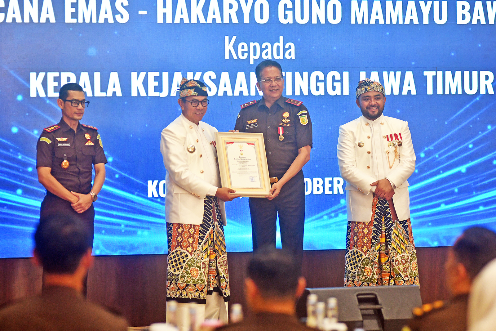 MALANGTREND.COM, KOTA BATU – Pemerintah Kota Batu memberikan penghargaan tertinggi Hakaryo Guno Mamayu Bawono kepada Kepala Kejaksaan Tinggi (Kajati) Jawa Timur Dr Kuntadi, SH, MH, sebagai bentuk apresiasi atas dukungan, sinergi, dan kontribusinya dalam memperkuat tata kelola pemerintahan yang transparan dan akuntabel di Kota Batu.