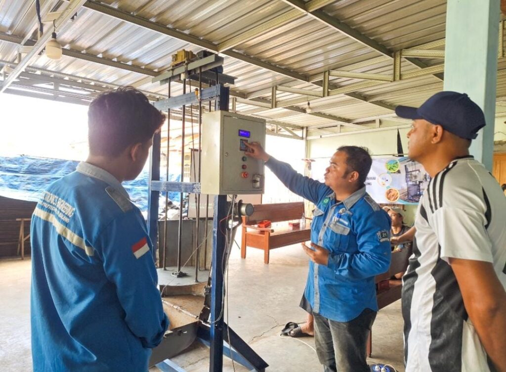 Penjelasan pengoperasian mesin press tembakau kepada mitra dari KUB Makmur Barokah.